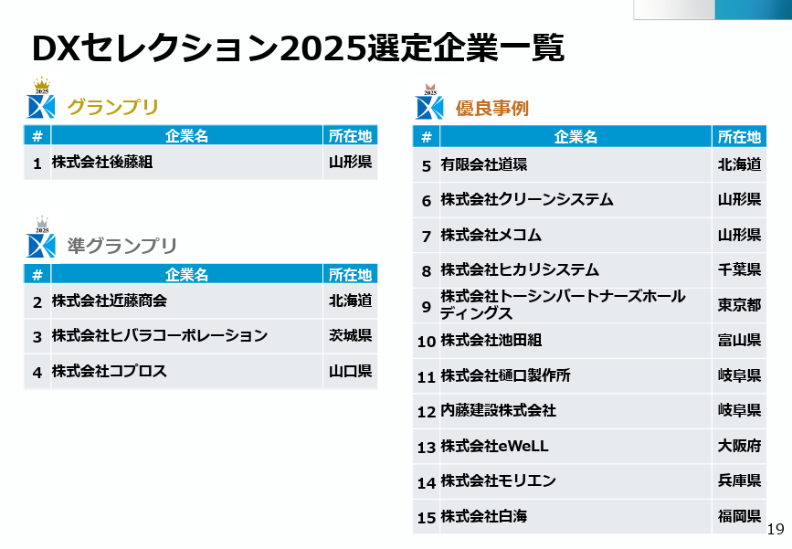 経済産業省の「DXセレクション」では、中堅・中小企業のDX優良事例が紹介されています。経済産業省は、「DXセレクション2025」を選定し、令和7年3月24日に開催した「DXセレクション2025表彰式」にて、「グランプリ」1社、「準グランプリ」3社、優良事例11社の計15社を選定しました。