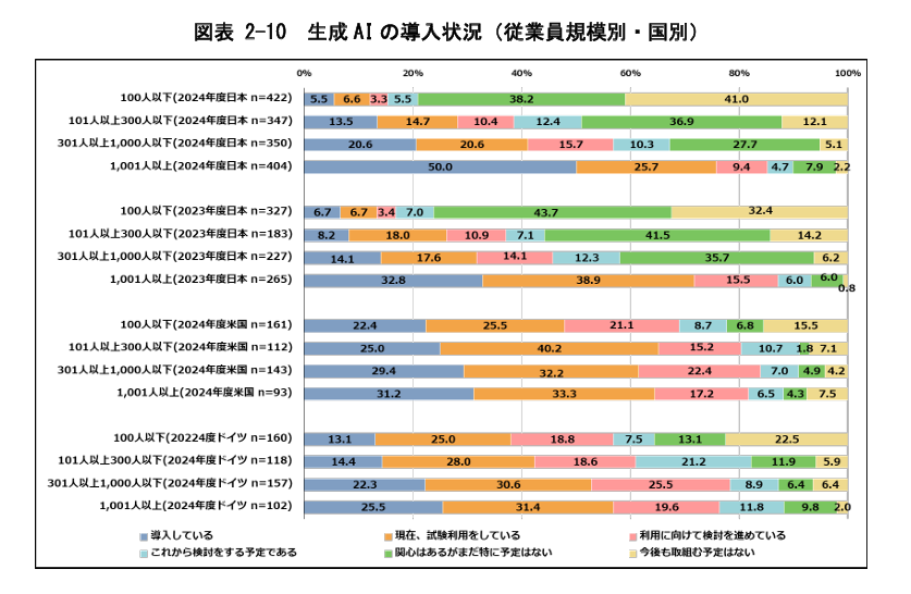 日本における生成AI導入について、従業員規模別での比較を見てみます。大企業は本格的に活用が進んでいることがわかる一方、従業員規模が少なくなるほど、導入は減少しています。生成AIの活用は業務の効率化や生産性向上に寄与する面が大きく、中小企業にもその効果は期待できるため、ぜひ活用を進めたいところです。