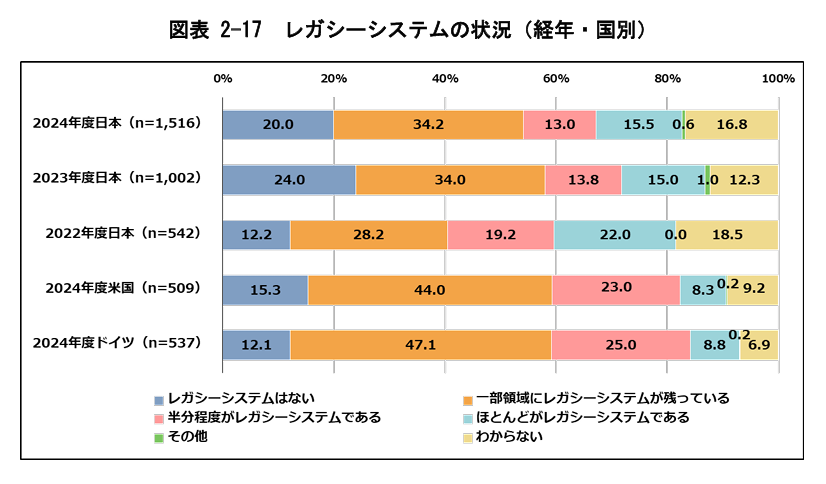 レガシーシステムの状況を3か国で比較すると、「レガシーシステムはない」の回答割合は日本が一番高いものの、「ほとんどがレガシーシステムである」「わからない」の回答割合も日本は一番高く見られました。レガシーシステムによるDXへの影響は、新規技術導入の遅れや、保守運用コストの増大、データ利活用などビジネスの機動性低下、セキュリティリスクが挙げられます。レガシーシステム刷新に踏み切れない企業では、「2025年の崖」を克服する道は険しいと考えられます。