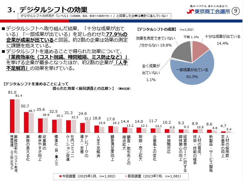 東京商工会議所の調査では、デジタルシフト・DXに取り組んだ企業のうち77.9%が「成果が出ている」と回答しています。さらに、効果として最も多いのは「業務効率化(コスト削減、時間短縮、ミス防止等)」81.0%で、まずは現場の負担を減らす領域で成果が出やすいことが分かります。