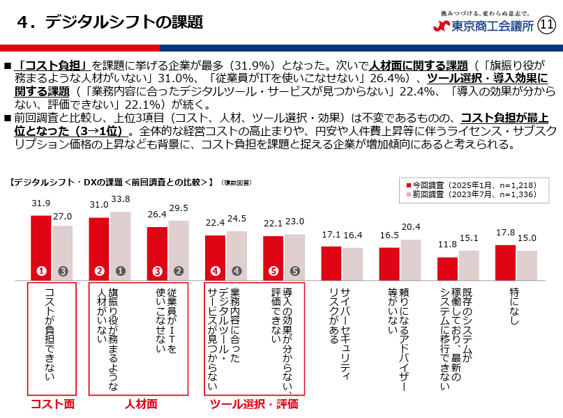 DXを継続的に進めるには壁もあります。東商調査では、課題として「コスト負担」31.9%が最も多く、次いで「旗振り役が務まる人材がいない」31.0%「従業員がITを使いこなせない」26.4%が続きます。