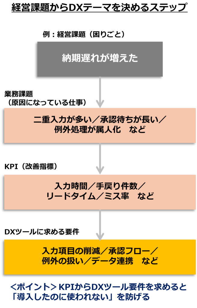 中小企業の失敗パターンは、ツール導入が先に立ち、目的と運用が後回しになることです。まずは「粗利が残らない」「納期遅れが増えた」「採用できない」など経営の困りごとを言語化し、原因となる業務を特定します。そのうえで、改善指標(例:入力時間、手戻り件数、リードタイム、ミス率)をKPIとして置くと、ツール選定がしやすくなります。