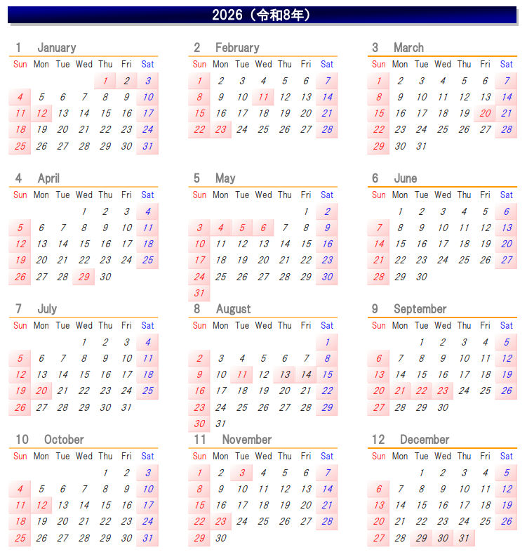 当社の営業日カレンダーです。お問合せの際にご参照ください。※土曜・日曜・祝日および日付がピンク色になっている日は、当社が定める休日となります。