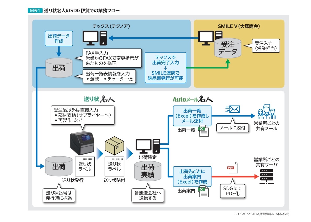 その一方で同社では長年使用して来た基幹システムを更新するタイミングを迎えており、そのタイミングでこれまで個社ごとに別々で運用していたシステムをSDGグループ内で統一化し、営業部との出荷情報共有等含めシームレスな情報連携体制を構築するDXプロジェクトも推進していた。そこでSDG伊賀では、喫緊の課題として送り状の修正作業問題にフォーカスして対策を検討し、物流上の個別の課題に対しては基幹システムに委ねることなく、それに特化したソリューションが適しているとの判断から送り状名人の導入を決定した(写真④)。
