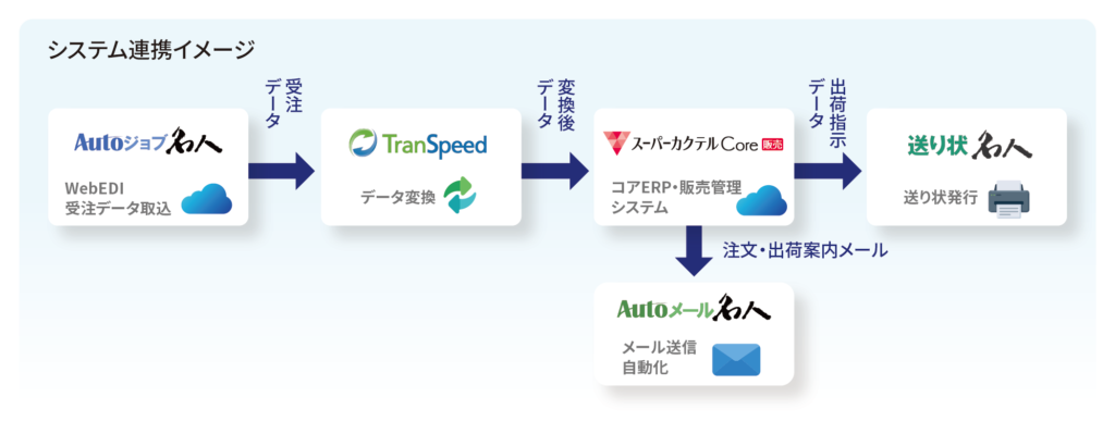 まず、ワークショップやホームセンターの各種WebEDIから受ける注文データ処理を、「Autoジョブ名人」と「TranSpeed」で自動化。基幹システム「スーパーカクテルCore」と連携し、仕分けリストやピッキング予定データ、入荷予定データの作成を効率化したことで、出荷までのリードタイム削減につながっています。