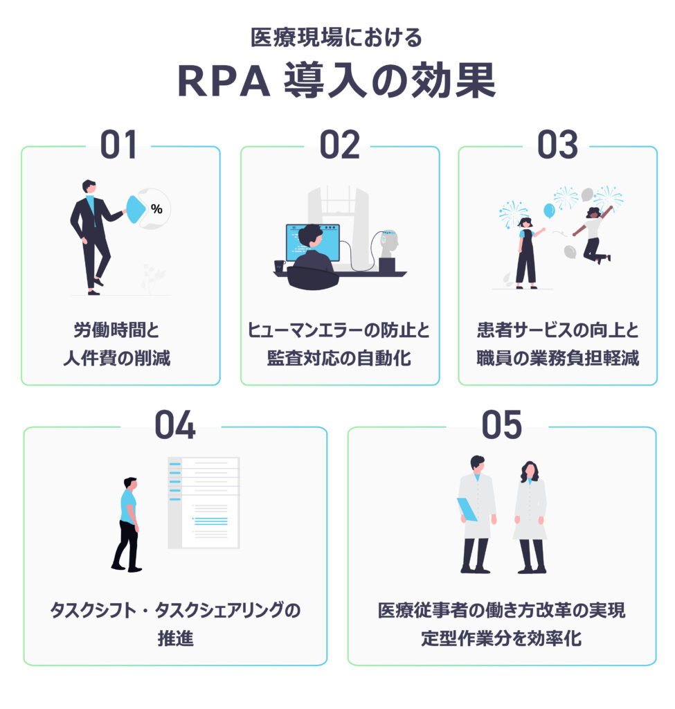 RPAは医療における定型業務を自動化できるため、結果として医療従事者全体の働き方改革を実現するための有効なツールとなります。